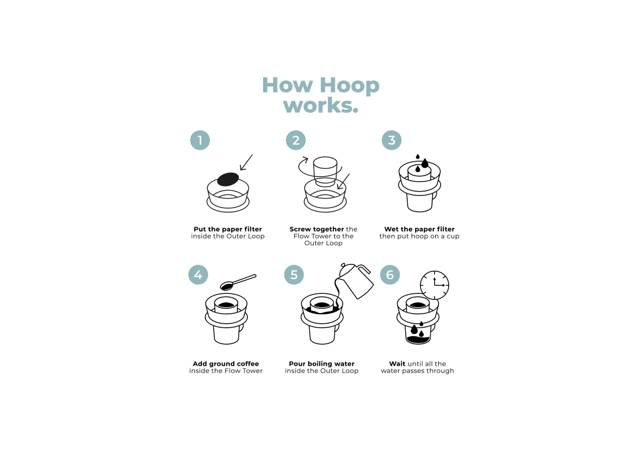 Hoop utilizza una tecnologia di infusione radiale attraverso la sua Flow Tower, garantendo che l’acqua passi attraverso il caffè in modo uniforme senza creare vie preferenziali. Inoltre, grazie ai fori presenti nella Flow Tower, l’acqua attraversa il caffè con la stessa quantità e intensità, assicurando un’estrazione omogenea di alta qualità. Con Hoop, puoi ottenere un caffè dalle caratteristiche piene e concentrate senza alcuno sforzo, poiché l’acqua raggiunge il filtro di carta solo dopo aver completato il passaggio attraverso il caffè.